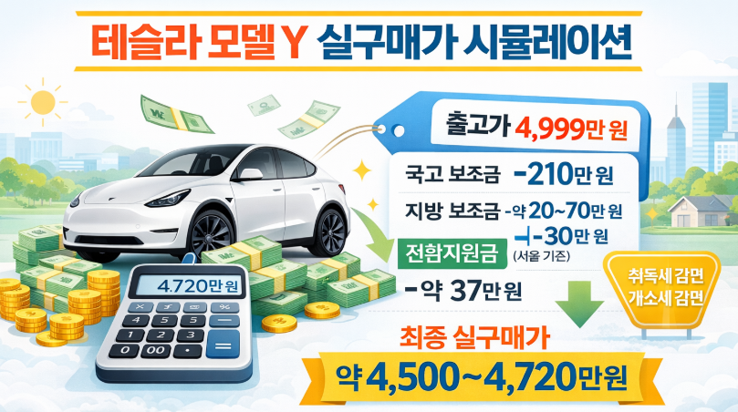 예를 들어 서울 거주자가 테슬라 모델 Y RWD를 구매할 경우, 출고가 4,999만 원에서 국고 보조금(210만 원), 서울시 보조금(약 30만 원), 전환지원금(약 37만 원)을 뺀다면 최종 실구매가는 약 4,720만 원 수준이 됩니다.